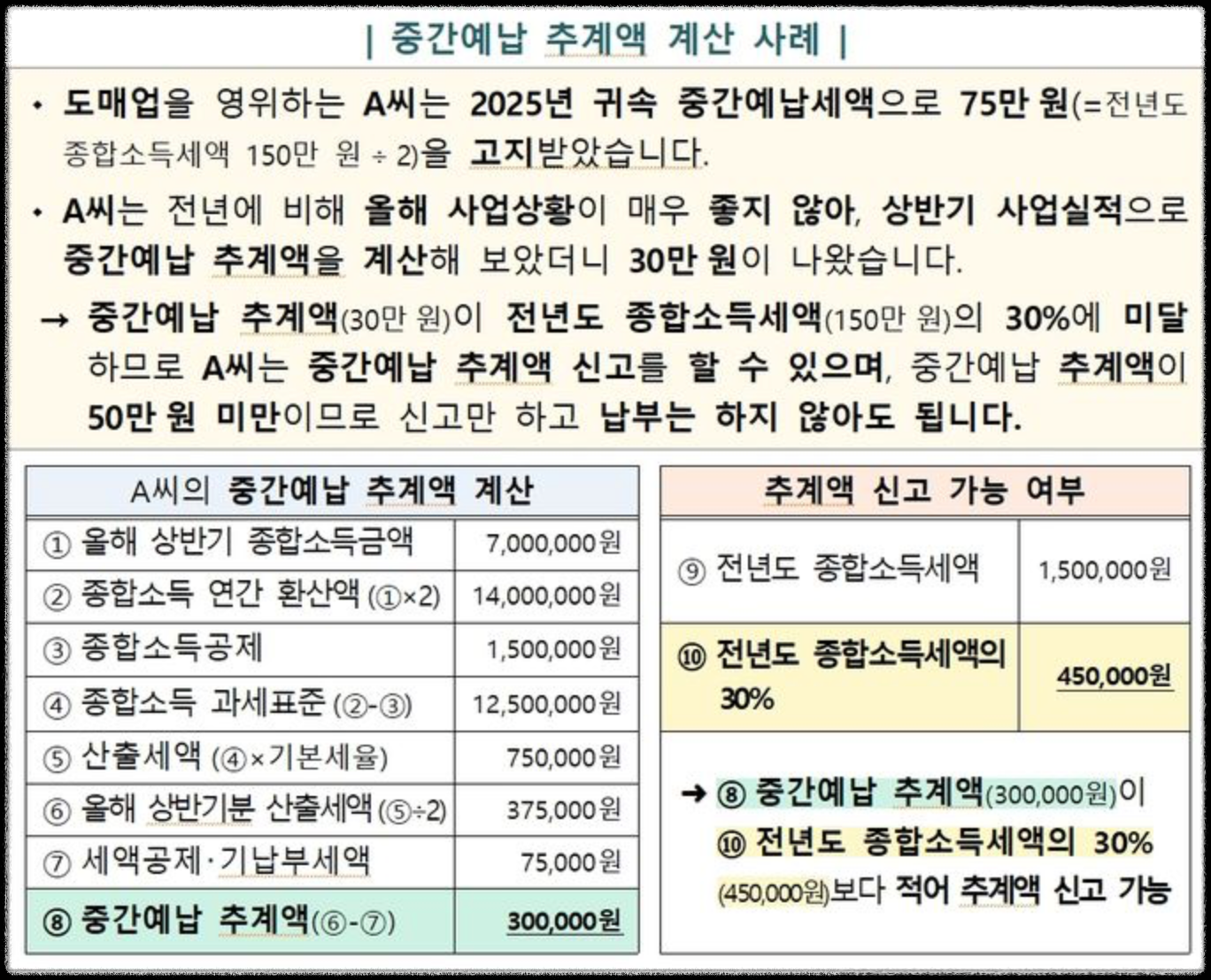 • 2024년 종합소득세 납부액이 200만 원이라면 👉 2025년 중간예납액 = 100만 원