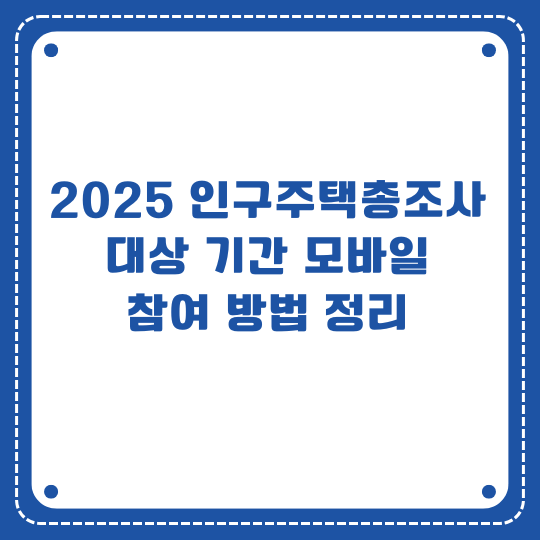 2025년 인구주택총조사가 시작됩니다.이번 조사는 온라인과 모바일로 간편하게 참여할 수 있으며,조사 대상자 선정 기준과 참여 일정, 구체적인 모바일 입력 절차까지 정리해드립니다. 인구주택총조사 참여 방법 인구주택총조사란 무엇인가요?인구주택총조사는 5년 주기로 통계청이 전국적으로 시행하는 국가통계 조사입니다.우리나라 인구 구조와 주거 현황을 파악해정부의 정책 기초자료로 활용되며,모든 국민의 생활과 밀접한 공공정책 수립에 사용됩니다.2025년 인구주택총조사, 누구를 대상으로 하나요?2025년 조사는 전수조사와 표본조사 방식이 병행되며,전체 국민 중 일부가 조사 대상으로 선정됩니다.조사대상자:대한민국에 거주하는 내국인 및 외국인 중표본으로 무작위 선정된 가구통지서 또는 안내문 수령 가구만 해당→ 우편, 문자,..