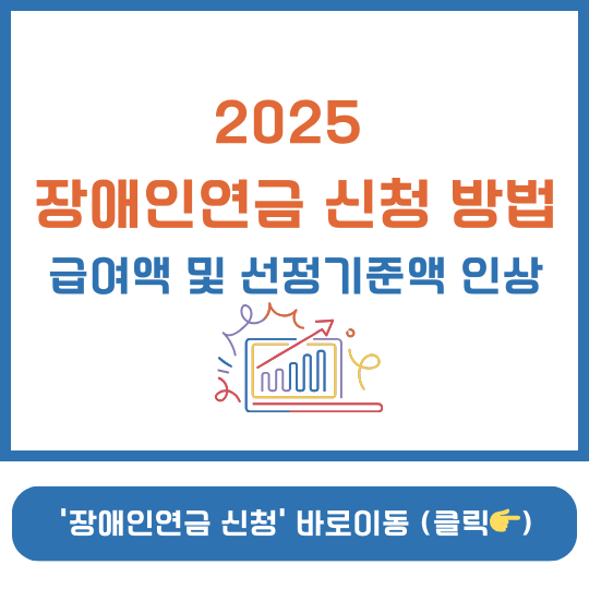 2025년 1월부터 저소득 중증장쟁인의 소득 보장을 위한 장애인연금 급여액이 인상이 되었습니다. 2024년 전국소비자물가변동률 2.3%를  반영하여 인상이 되었고, 부가급여 9만 원을 합산하여 월 최대 43만 2,510원을 받을 수 있습니다. 이 글에서 2025 장애인연금 인상 및 신청방법, 급여액, 선정기준액까지 자세하게 알아보도록 하겠습니다.  ▤ 목차장애인연금 개요 장애인연금이란? 장애로 인하여 생활이 어려운 중증장애인의 생활 안정 지원, 복지 증진 및 사회통합 촉진을 하기 위한 사업 목적을 두고 있습니다.  장애인연금 급여액 인상 2025년 1월부터 장애인연급 급여액이 물가변동에 따라 기초급여액 인상으로 월 최대 43만 2,510원을 지급받게 됩니다. 장애인연금 급여 (2025년 기준) : 기초급..