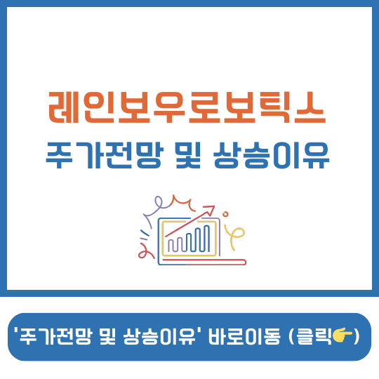 2025년 1월 2일 레인보우로보틱스 주가가 정말 많이 올랐습니다. 레인보우로보틱스는 협동로봇의 사업을 영위하며, 미래에 대한 투자를 하는 기업입니다. 이번 글에서 레인보우로보틱스 주가 전망 및 배당금, 삼성 인수 이유까지 알아보도록 하겠습니다.     ▤ 목차 레인보우로보틱스 기업 개요 레인보우로보틱스 기업 개요 및 기본 정보를 먼저 알아보도록 하겠습니다.  설립일 : 2011. 2. 10상장일 : 2021. 2. 3대표이사 : 이정호시가총액 : 4조 1,031억 원시가총액 순위 : 코스닥 5위상장주식수 : 19,399,858 액면가 : 500원외국인 보유주식수 : 1,250,431주 (외국인소진율 6.45%) 레인보우로보틱스는 한국과학기술원 휴머노이드로봇연구센터의 연구원들이 창업한 전문 벤처기업입니다..