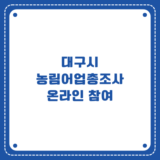 대구에 거주하는 농가·임가·어가라면 농림어업총조사에 꼭 참여해 주세요.2025년 조사는 인터넷으로도 간편하게 응답할 수 있어요.응답 방법부터 유의사항까지 한눈에 정리해드릴게요. 대구시 농림어업총조사 온라인 참여📍 대구시 농림어업총조사, 왜 참여해야 하나요?2025년 농림어업총조사는 농업·임업·어업에 종사하는 가구의 실태를 조사하여, 정책 수립의 기초자료로 활용됩니다.대구시에 거주하면서 관련 활동을 하고 있다면 반드시 참여 대상에 포함될 수 있어요.🖥 인터넷 참여 방법, 이렇게 하세요① 안내문에서 참여번호 확인사전에 받은 우편 또는 문자 메시지를 통해 참여번호(또는 QR코드) 를 확인해 주세요.② 공식 홈페이지 접속포털에서 ‘농림어업총조사’ 검색공식 홈페이지 접속 후 ‘인터넷 조사 참여’ 클릭③ 본인 ..