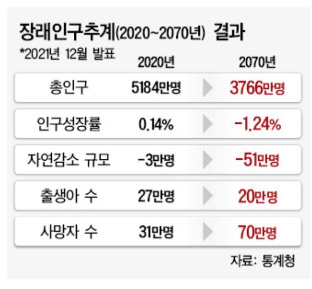 2070년엔 대한민국의 인구가 어떻게될까? (총인구는 2020년 5,184만명에서 2070년 3,766만명으로 감소) □ (총인구) 2020년 현재 5,184만명에서 향후 10년간은 연평균 6만명 내외로 감소해 2030년 5,120만명 수준으로 감소하고, 2070년에 3,766만명(1979년 수준)에 이를 전망하고있습니다. ㅇ 저위 추계(낮은 출산율, 기대수명, 국제순이동) 가정시 2070년 인구는 3,153만명(1969년 수준), 고위 추계 가정시 2070년에 4,438만명(1993년 수준) □ (인구성장률) 2021~2035년까지는 -0.1% 수준, 이후 감소 속도가 빨라져 2070년에는 -1.24% 수준으로 전망 □ (자연증가) 자연감소(출생아수-사망자수) 규모는 2020년 -3만명에서 2030년 ..