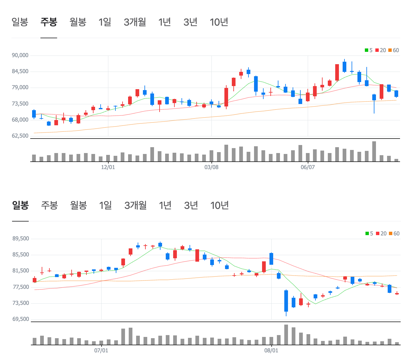 ▤ 목차삼성전자 보통주 우선주 주가 전망과 최근 주가가 상승하는 이유까지 알아보도록 하겠습니다.삼성전자는 또한 배당금을 1년에 4번 지급하고 있는데 이번 분기의 배당금과 조회하는 방법까지 확인하면 내가 받을 수 있는 배당금까지 확인을 할 수 있습니다.또한 삼성전자 상승하는 호재 내용을 먼저 알고 싶으시다면 아래 버튼을 클릭하여 확인해 보시기 바랍니다.삼성전자 호재 보러 가기  삼성전자 보통주, 우선주 주가 전망  8월 20일 금일 삼성전자 보통주 주가는 79,500원이며, 우선주는 63,700원입니다.  8월 2일보다는 현재 많은 주가가 상승한 것으로 보여지며, 주식 차트 일봉으로 보았을 때는 바닥권에서 다시 상승하려는 모습을 보이고 있습니다. 8월 초에 하락을 삼성전자 보통주와 우선주가 하락을 한 이유..