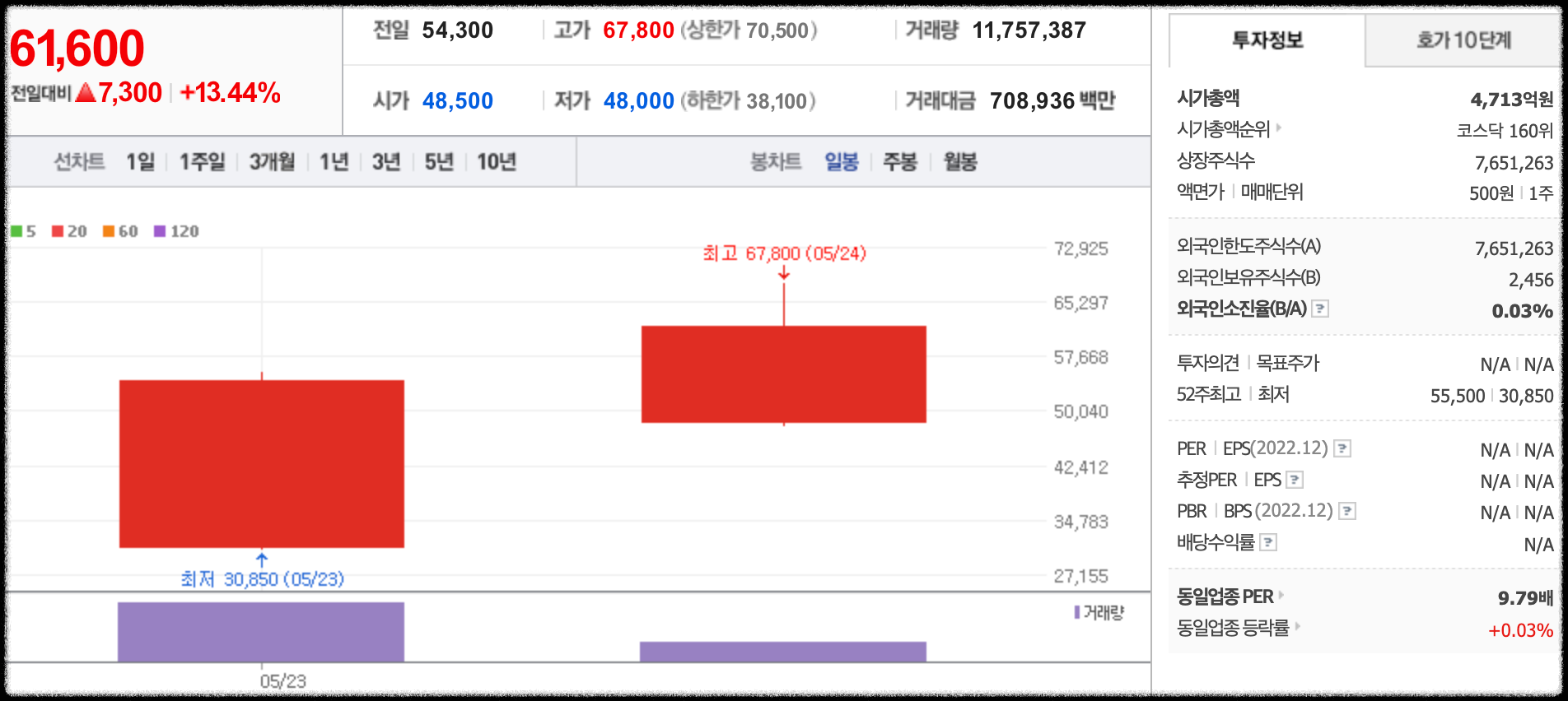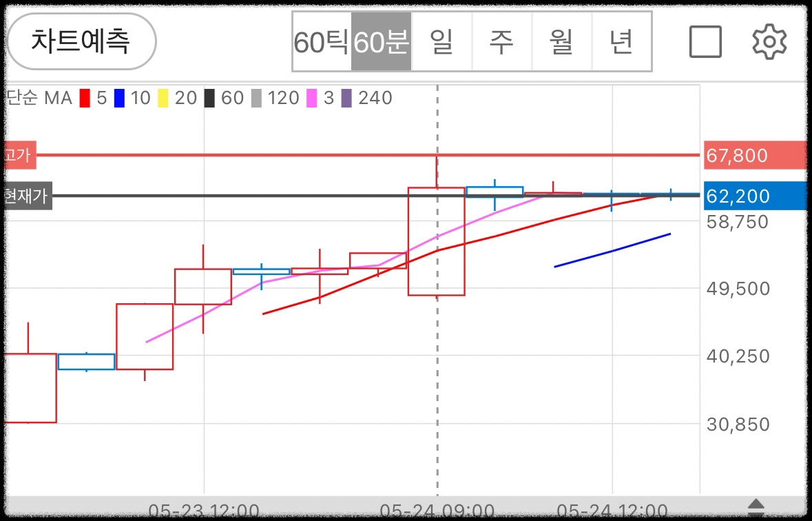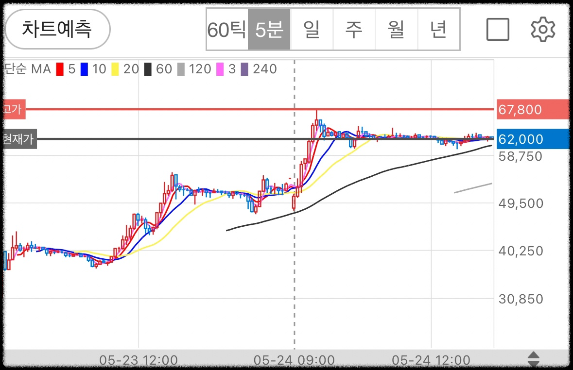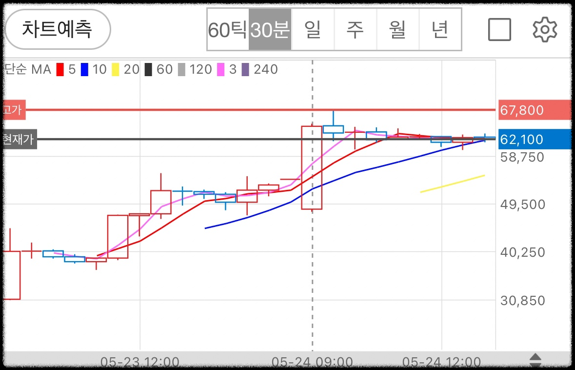 신규 상장 주식일 경우 단기로는 5분봉, 10분 봉을 보는 것을 추천하며, 중장기로는 30분, 60분, 240분 봉을 확인하는 것을 추천드립니다.