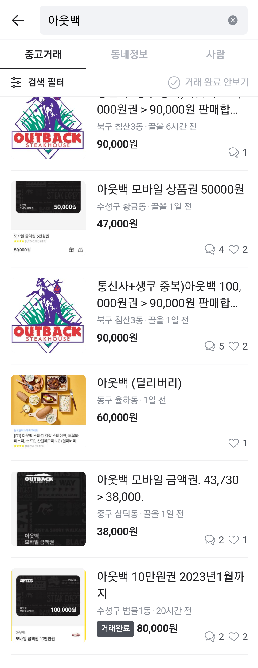 당근마켓 회원가입하시고 검색에 "아웃백" 이라고 검색합니다.