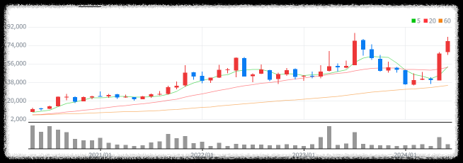 주봉차트와 월봉차트는 비슷한 추세로 현재 상승 추세를 타며 주식이 오르고 있습니다. 긍정적인 정배열 추세이지만, 단기적으로 상승을 한 부분이 있어서 현재 이동평균선보다 갭을 많이 띄운 부분을 보여지고 있습니다.