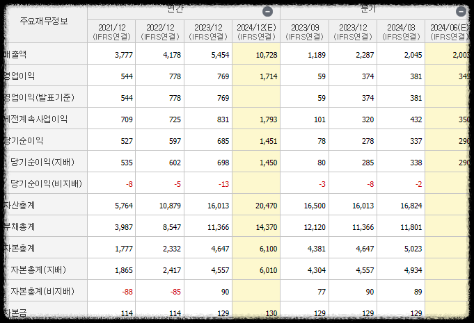 영업이익,순이익 또한 작년인 2023년보다 2배이상 늘어난 부분을 알수있으며, 자산총계는 늘어나는 것을 보면 현재보다 앞으로가 더욱 기대되는 기업입니다.