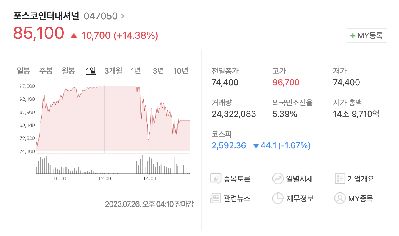 - 수요일인 오늘 포스코인터내셔널은 85,100원을 기록하며 마쳤으며, 포스코그룹사 중 오늘 가장 강한 흐름을 보여줬으며 , 장중 상한가도 기록을 하였습니다. 그렇지만 오늘 2차 전지 차익 실현 매물들이 매도세가 강하여 장중 상한가 풀린 뒤 하락 후 반등한 모습을 보여줬는 주식입니다.