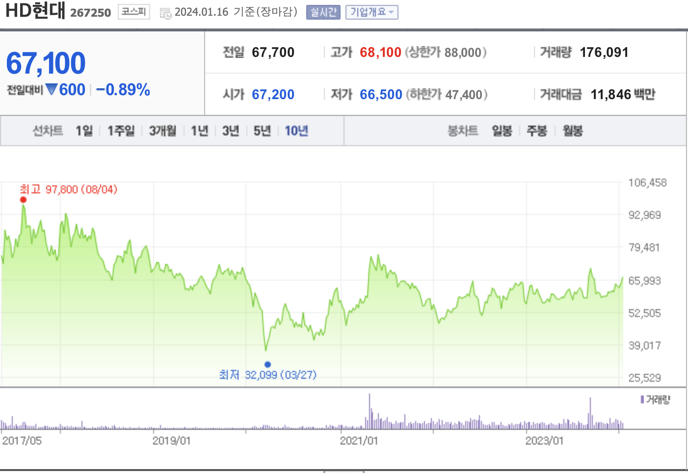 HD현대가 출범되고 상장된 10년 차트를 보게 되면 최고점인 97,800원이며, 현재는 그보다 많이 빠졌기때문에 투자하기에도 나쁘지않은 가격대라고 생각이 드는 기업중 하나입니다.
