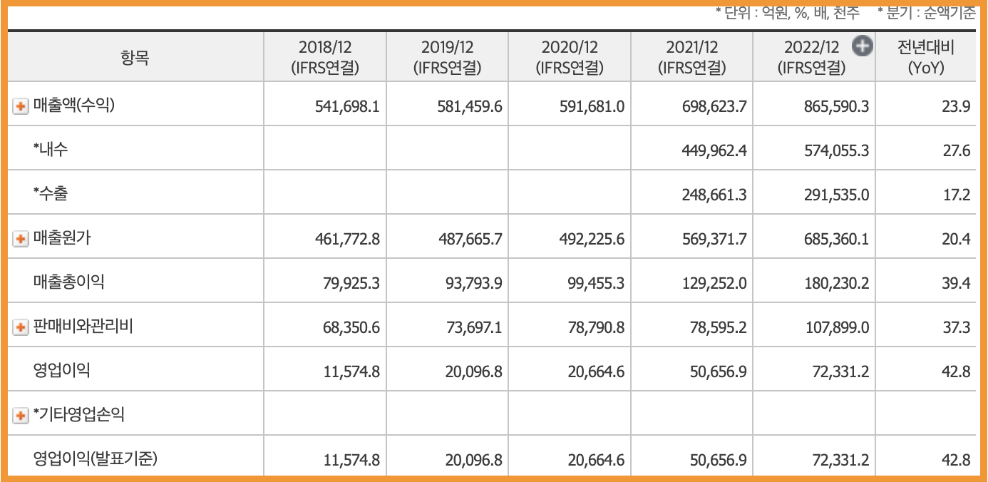 2018년도부터 매출액이 우상향을 하였으며, 매출액이 많이 오르면서 영업이익도 크게 오르게 되었습니다. 현대차도 자동차산업이 최근에 성장을 많이하면서 기아차 또한 매출액과 영업이익도 크게 많이 오른것으로 보입니다.