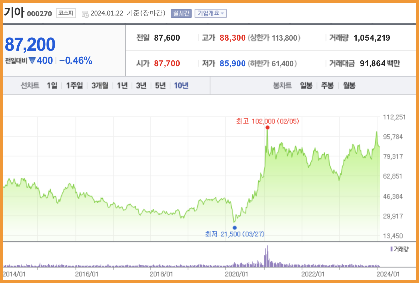 현재 기아의 주가1주당 87,200원을 기록하고 있습니다. 2020년에 최고 10만원까지 오른것을 보면 주가는 많이 내린 상태지만 2023년에 6만원대 하였던 주가로 보았을때에는 많이 오른것으로도 보입니다.