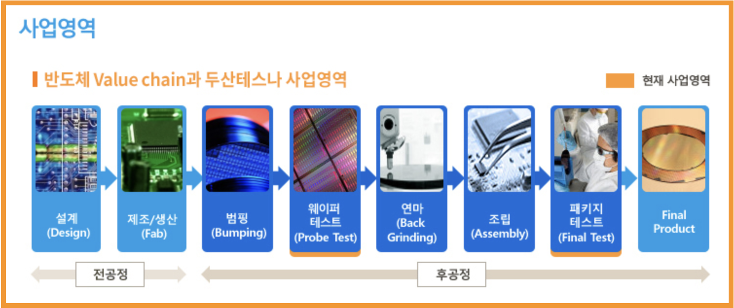 반도체에는 공정이 있습니다. 좌측부터 설계 -> 제조/생산 -> 범핑 -> 웨이퍼 테스트 -> 연마 -> 조립 -> 패키지 테스트 -> 파이널 프로덕트 순으로 반도체 밸류 체인은 이렇게 공정이 만들어지게 됩니다. 그 중 반도체를 제조하고 생산하고 범핑 (반도체 후공정에서 전기적 흐름의 효율성을 최대화하는 반면 웨이퍼의 크기를 최소화시키는 기술) 후 제품이 괜찮은지 불량이 없는지 웨이퍼 테스트를 하기 때문에 반도체에는 더욱 중요한 역할을 하는 것이기 때문에 이 부분이 두산테스나에서 하는 사업이며, 가장 큰 매출을 올리기도 하는 것입니다.