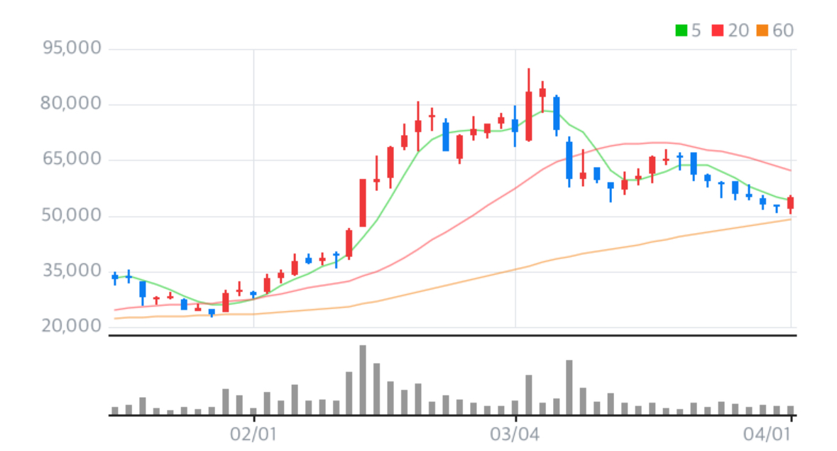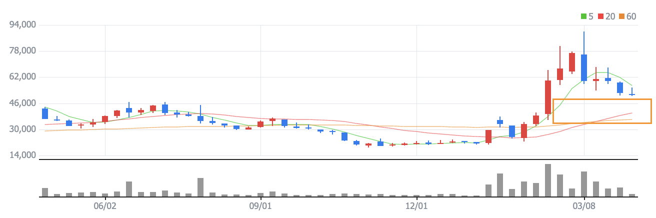 2024년 1월 12일부터 3월 6일까지 2만 원 주가가 8만 원 이상까지 올랐으며 그 이후 계속된 하락을 하고 있습니다. 일봉 차트로 보았을때 계속된 하락을 한 뒤 이동평균선인 60일선을 기준으로 반등을 한 것으로 보입니다.