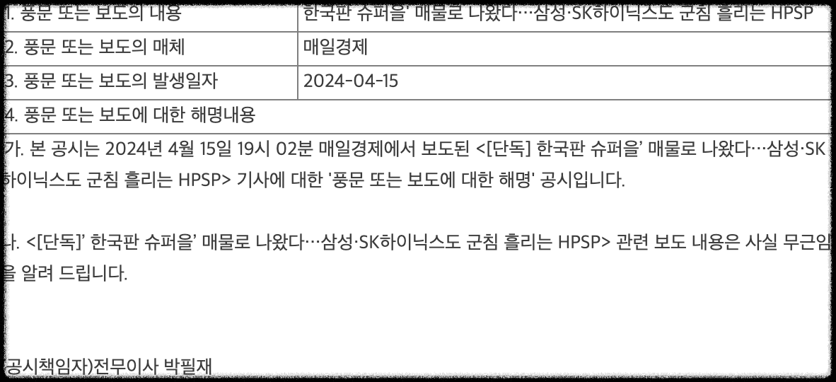 또한, 현재 HPSP 찌라시가 돌면서 공시를 발표한 사건이 생겼는데 소문은 다음 아래와 내용이 같습니다.