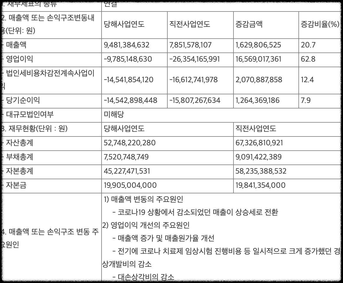 영업이익과 당기순이익은 마이너스이지만, 전년분기에 비하여 많은 영업이익과 순이익이 실적이 오른 것을 알 수 있습니다.