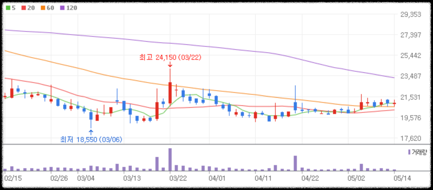 현재 기관은 4월 15일부터 5월 14일까지 6 거래일 빼고는 모두 순매수를 하여 보유량을 늘리고 있으며, 외국인 투자자들 또한 같은 기간 동안 7 거래일 빼고 순매수를 하였기 때문에 수급으로는 긍정적인 모습으로 보입니다. 수급이 좋은 부분으로 보아서는 현재 현대바이오이 개발하는 항암제에 대한 부분이 긍정적이며, 현재 '제프티'가 호흡기 질환효능에 긍정적인 모습을 보이고 있으며, 이 부분이 추후 임상과 개발 과정에 결과가 더욱 좋아야 주가가 상승할 것으로 보입니다.